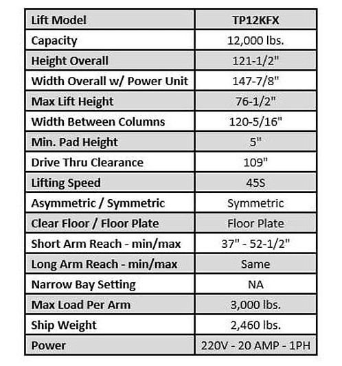 Tuxedo 12,000 lb Two Post Floor Plate Lift Introducing the New TP12K & TP15K ‘X HD Series Two Post Lifts!! The new TP12KFX & TP15KCX Two Post Floor Plate & Clear Floor Lifts have been redesigned and now come standard with Low profile Drop-In Adjustable Swivel Pads with Height Adapters, Internal Hose Routing, Padded Overhead Shut-Off Bar with Kill Switch, reduced overall Width, & Rubber Door Guards, making these models some of the best heavy duty Two Post Lift values in the industry! Features 12,000 lbs Capacity Symmetric Arms Rubber Door Guards Chain Drive Cylinders Dual Point Lock Release auto Arm Restraint System Spin Up Lift Pads Stackable Adapters Included Internal Hose routing Specifications Lift Model TP12KFX Capacity 12,000 lbs. Height Overall 121-1/2″ Width Overall w/ Power Unit 147-7/8″ Max Lift Height 76-1/2″ Width Between Columns 120-5/16″ Min. Pad Height 5″ Drive Thru Clearance 109″ Lifting Speed 45S Asymmetric / Symmetric Symmetric Clear Floor / Floor Plate Floor Plate Short Arm Reach min/max 37″ 52-1/2″ Long Arm Reach min/max Same Narrow Bay Setting NA Max Load Per Arm 3,000 lbs. Ship Weight 2,460 lbs Power 220V 20 AMP 1 PH Manual Tuxedo TP12KFX 12,000 lb Two Post Floor Plate Lift Manual